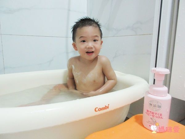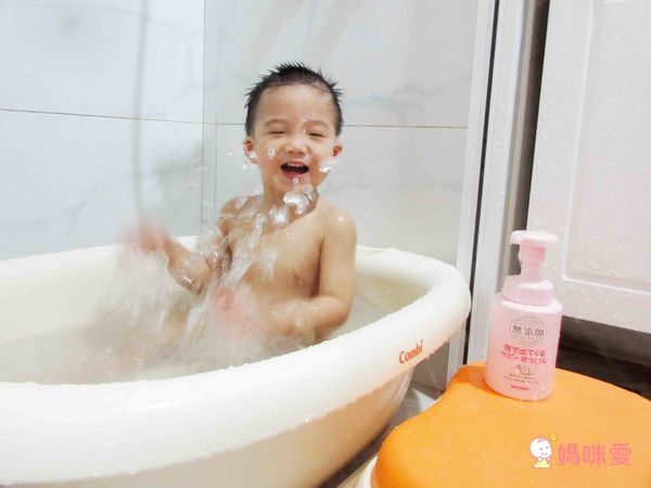 開始洗香香囉~寶貝看到泡泡還會自己搓揉呢~成功邁向自己洗澡的第一步。