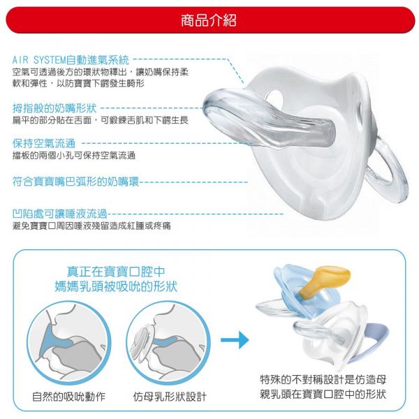 - 拉環與擋片貼合,俯臥或翻身時,奶嘴更貼合臉部