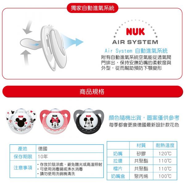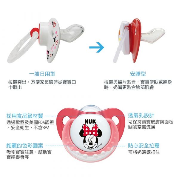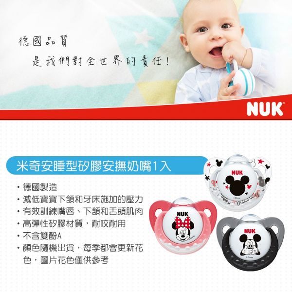 德國 NUK 米奇安睡型矽膠安撫奶嘴-初生型0m+1入-顏色隨機出貨