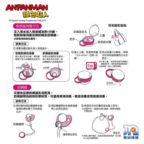 - 保潔盒內可放入安撫奶嘴、奶嘴鏈、奶嘴!放入微波爐加熱1分鐘即可達到消毒效果。